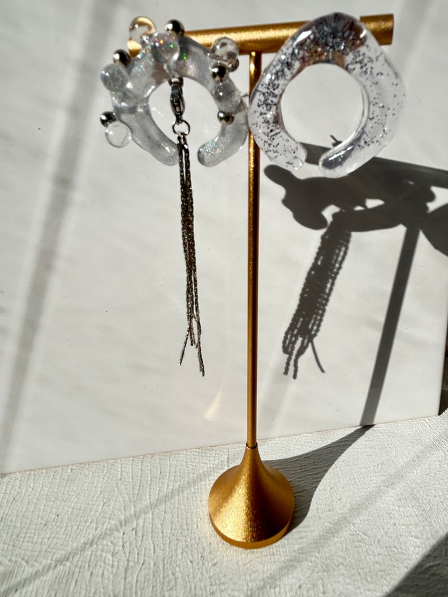 ホースシューをイメージして、 ピアスを作りました! こちらアシンメトリーピアスになっており、 両方のピアスに金具を付け外し出来るように小さいカニカンを付けています。 ごちゃごちゃした丸が付いたパーツが1個しか作成出来ませんでしたので、1個限定となります。 反対側のサラッとしたピアスは こちらも金具が付いており、チェーンの移動が可能です。 こちらは黒の着画に出てくる、ギラギラしたピアスか、サラッとラメ入りピアスかどちらかお好きな方を選べるようにしました。 お好みでご注文ください! モードなファッションに良く合う、モードじゃ無くても着けられる非常に 可愛いピアスです。 冬のクリアはやはり可愛く、これを着けて新年、どういう自分になれるかなあ。と想像してみてください☺️ 勿論オールブラックコーデにも。 私の着画で着ているものはGUのシャギーニットですが、 ピアスのある無しで全然様子が変わってきます!! こちら2点限定、再販の予定は ございません! 気になる方は早めのポチをオススメ致します! それではまたね! ネットショップでお会いしましょう! 待ってるよー! ——————————————————————— ◾️ 私らしくありたいすべての人へ 「身につけるアートでもっと自由に。」 私は画家として描いた一枚の絵を切り取り、 アートジュエリーへと再構築しています。 すべて一点物。 同じものは二度と生まれない、 誰とも被らないアートアクセサリー。 流行に縛られず、 自分の感性で自由に生きたいあなたへ。 身につけることで、世界の見え方が少し変わります。 ▪️公式LINEにご登録頂くと初回500円オフクーポンが貰えます! 公式LINEの登録はこちらよりどうぞ →@189anxk