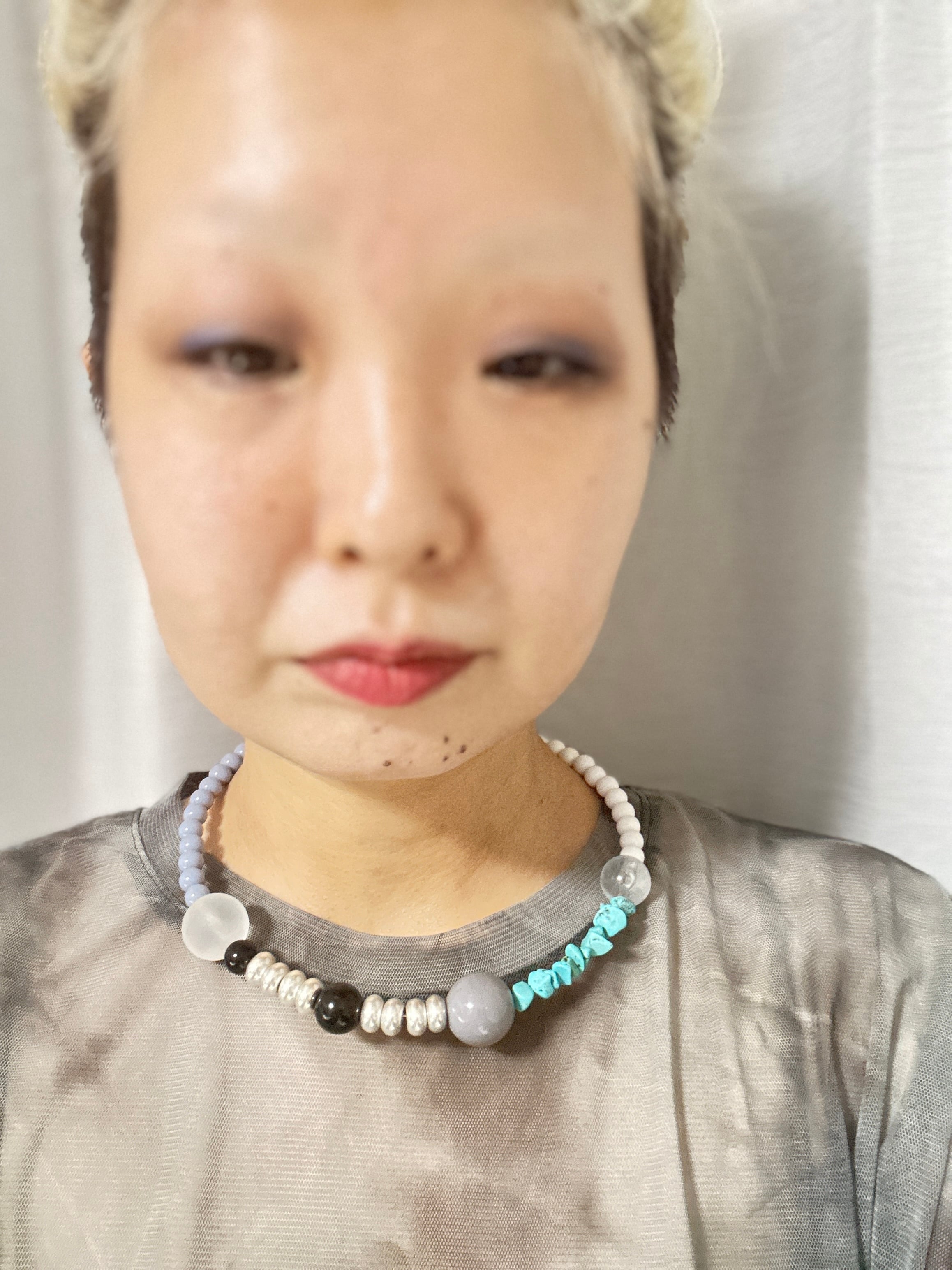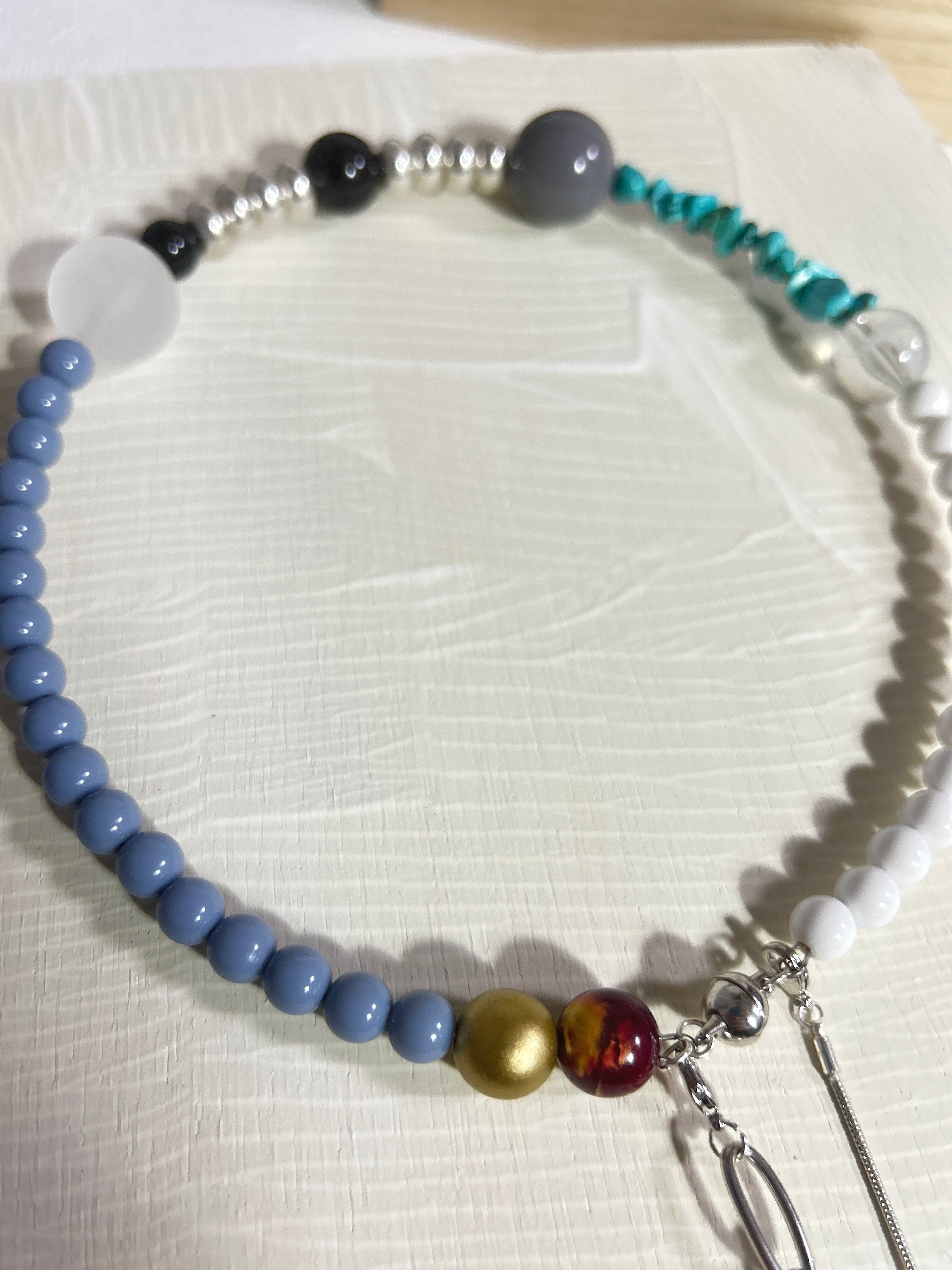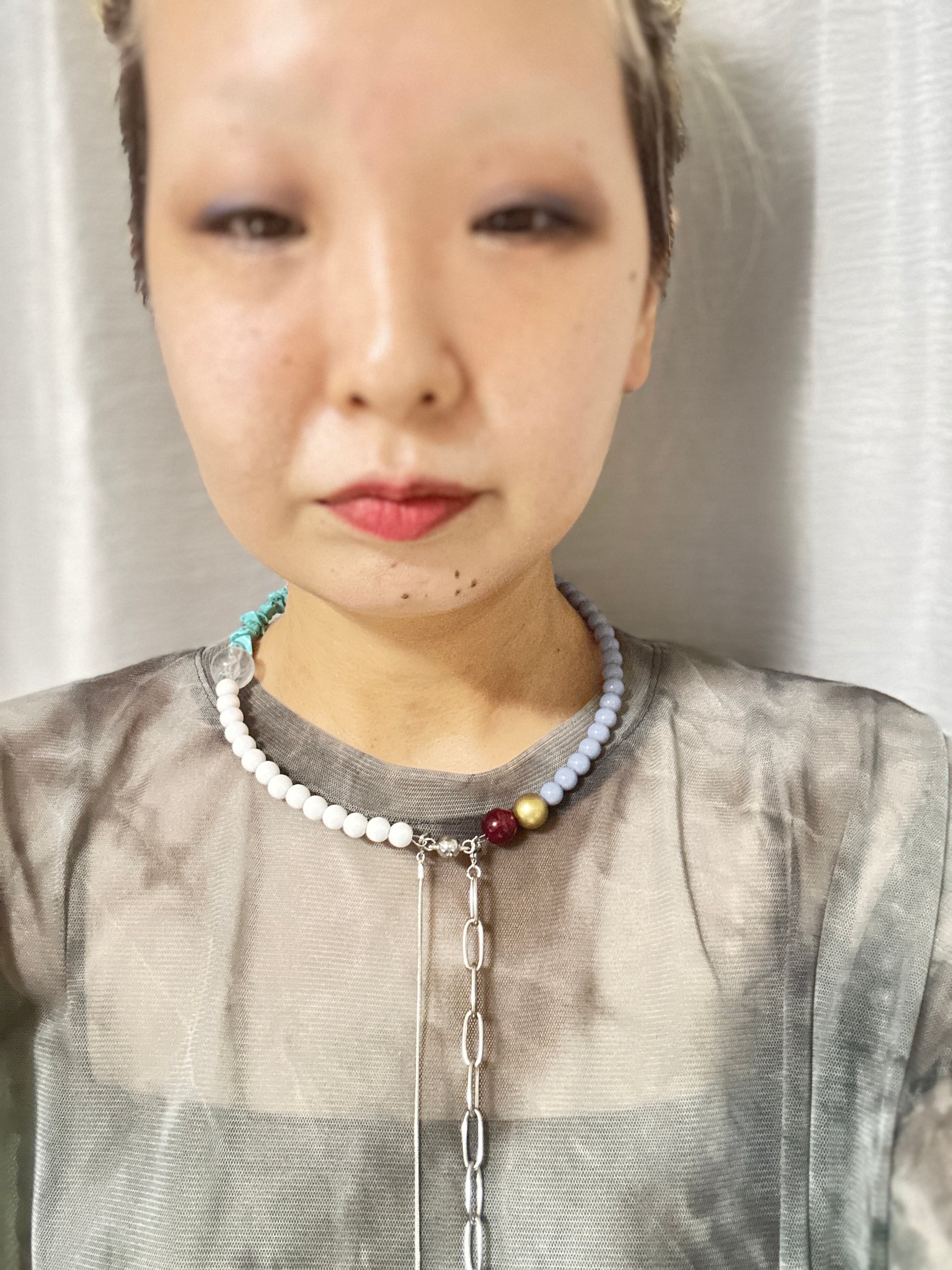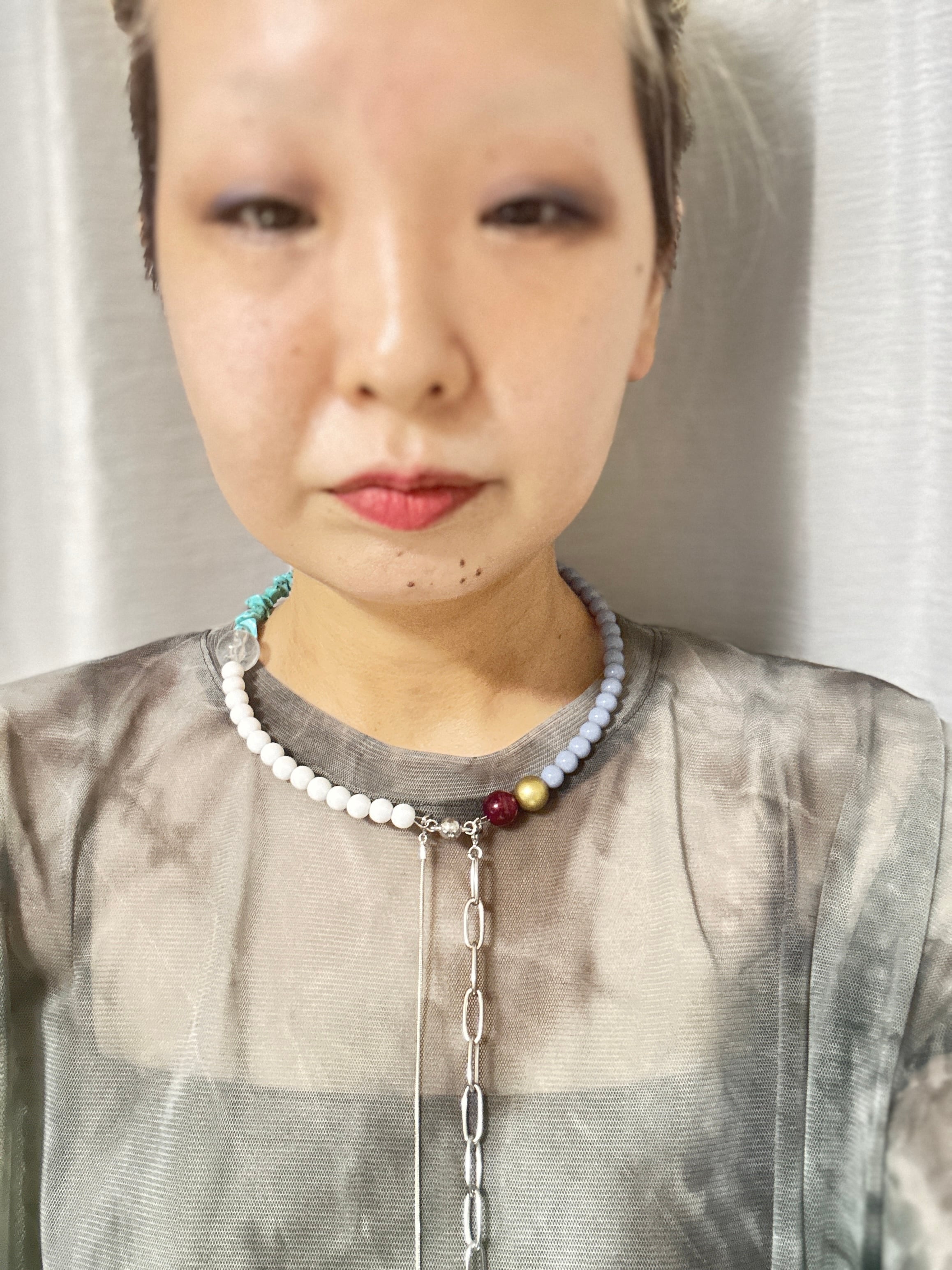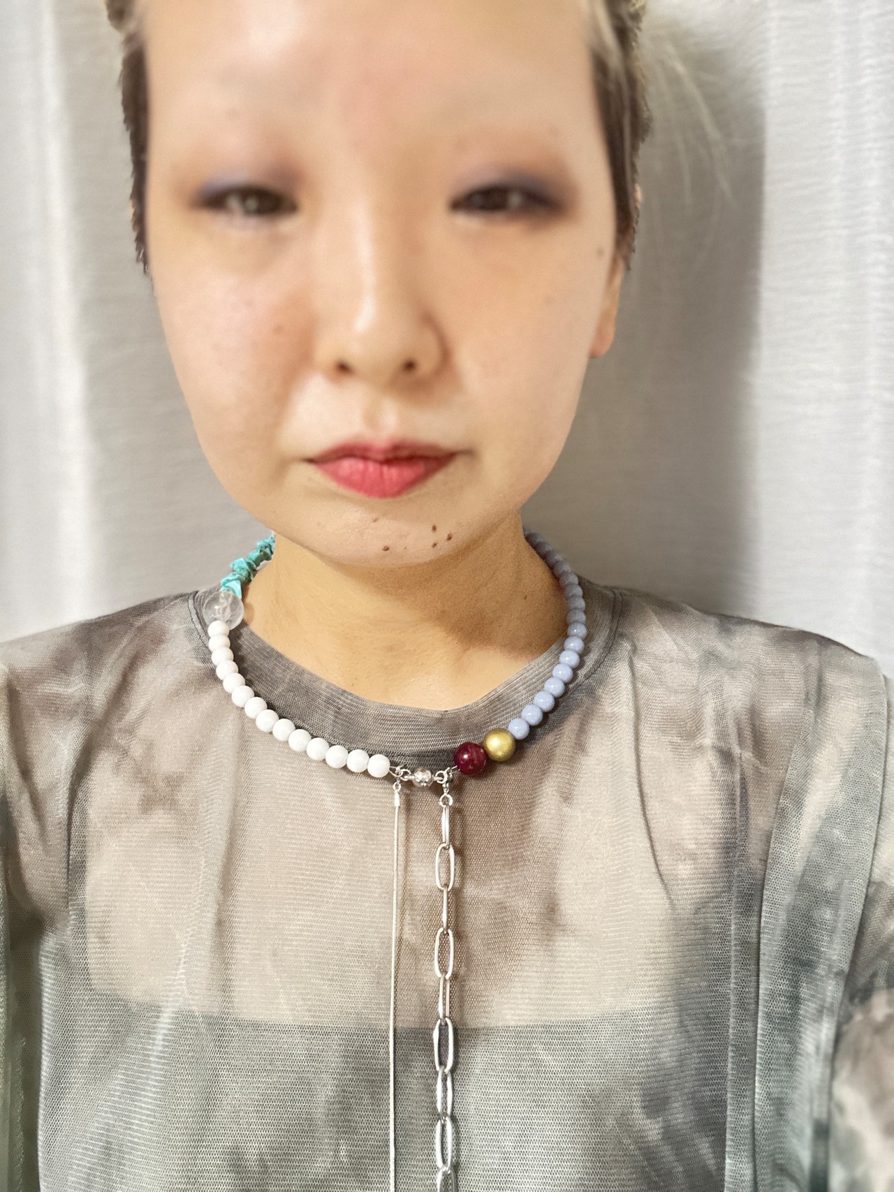 あとは後ろにチェーンを回すと普通のビーズのネックレスを着けているようですが、