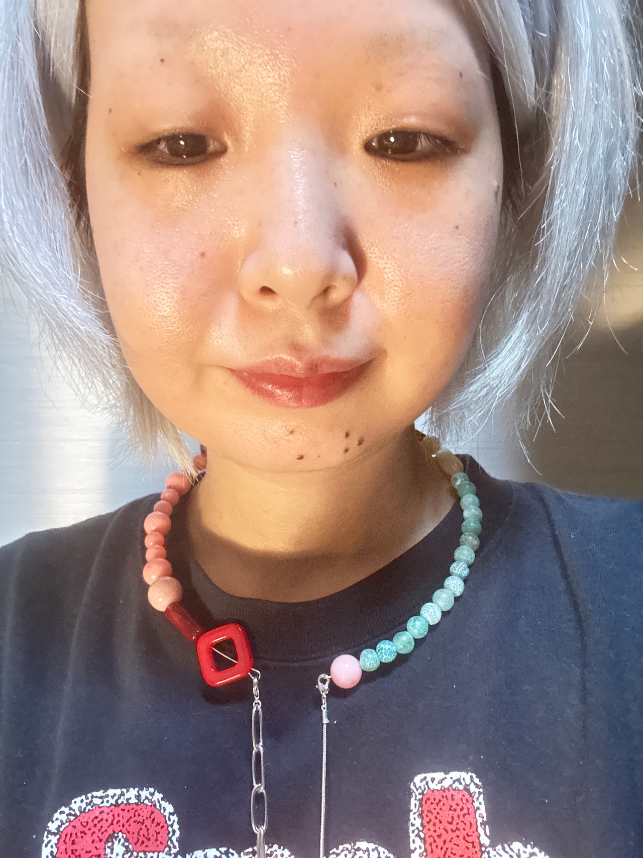 あとは後ろにチェーンを回すと普通のビーズのネックレスを着けているようですが、