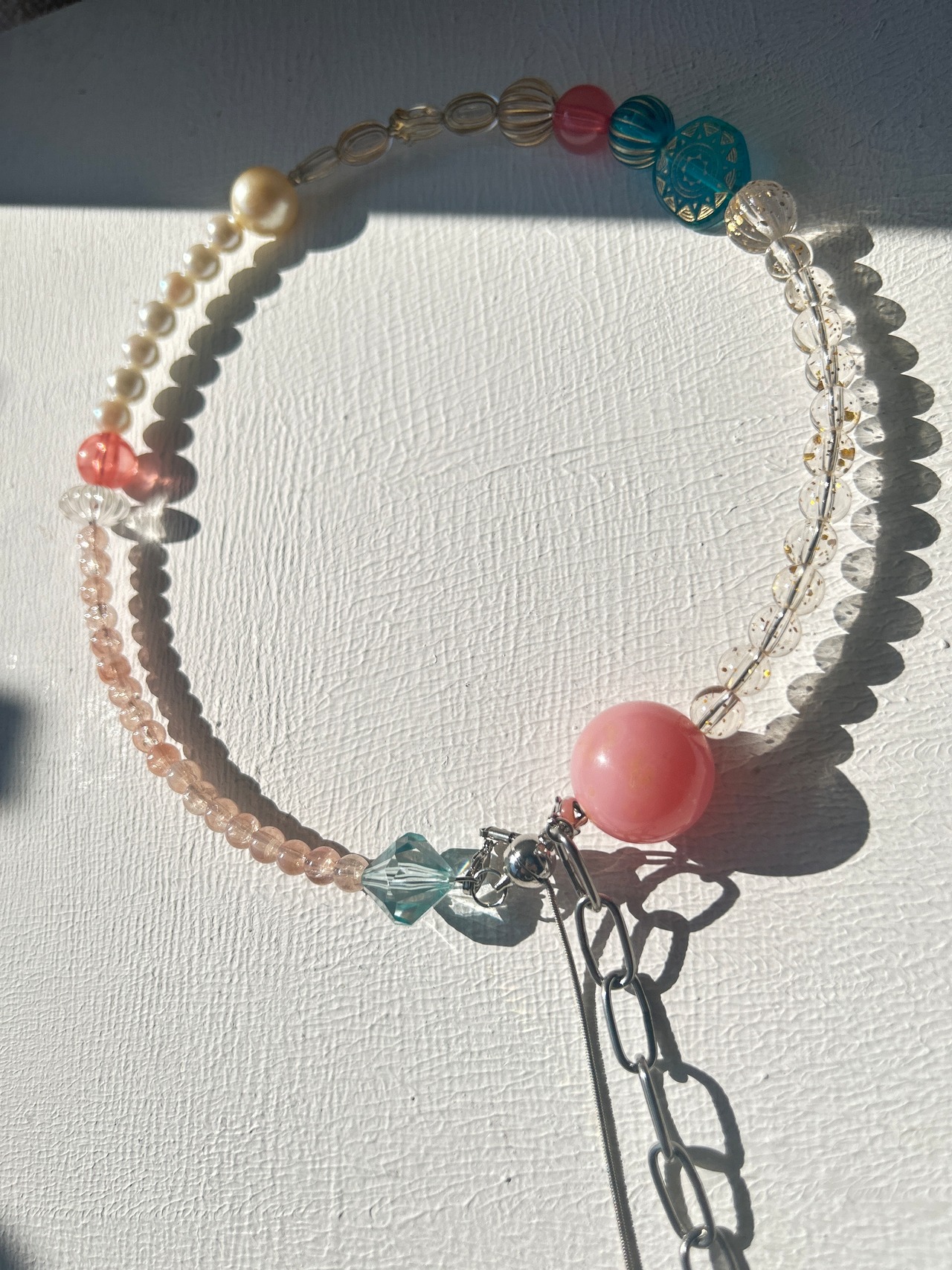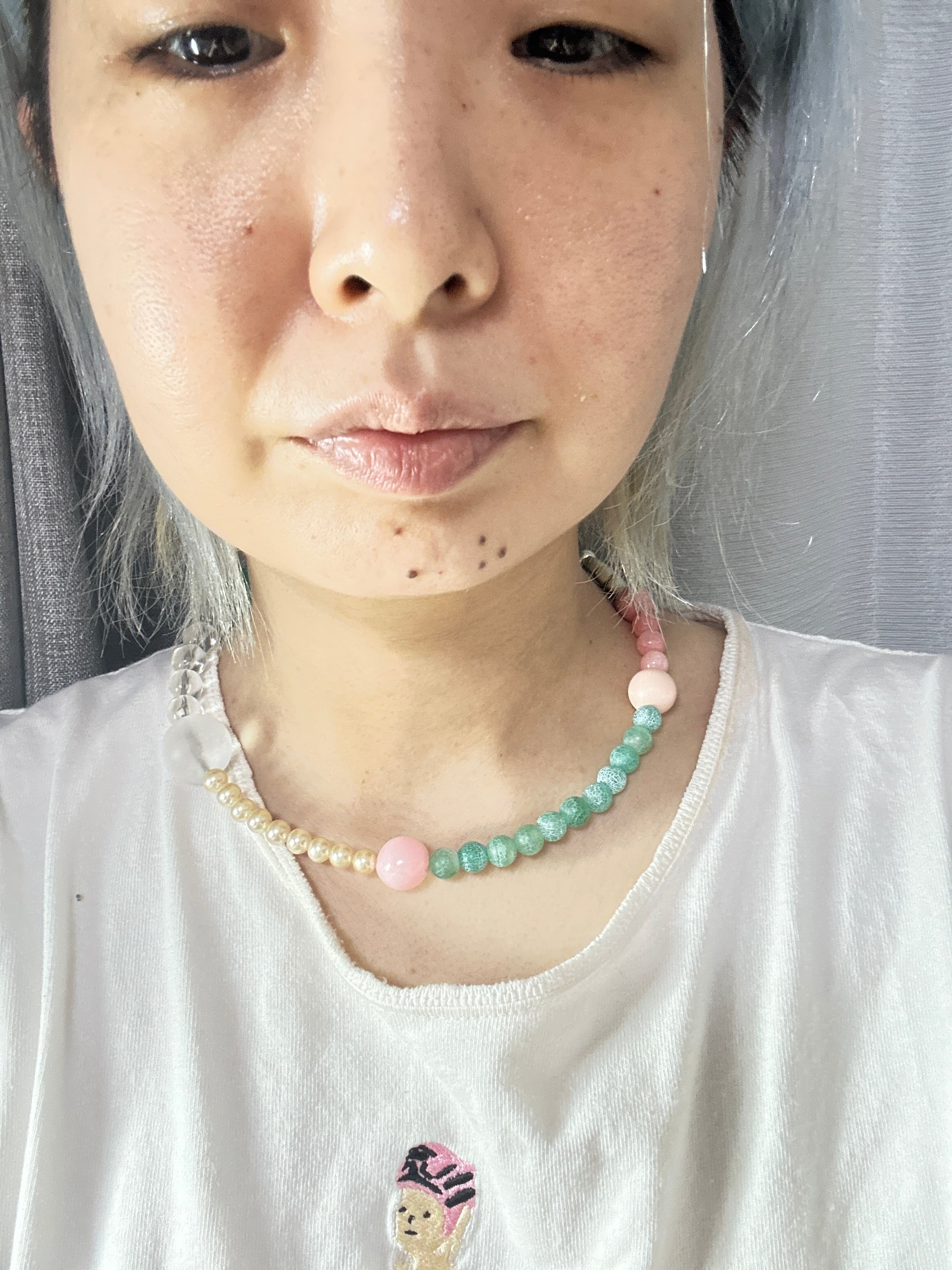 あとは後ろにチェーンを回すと普通のビーズのネックレスを着けているようですが、