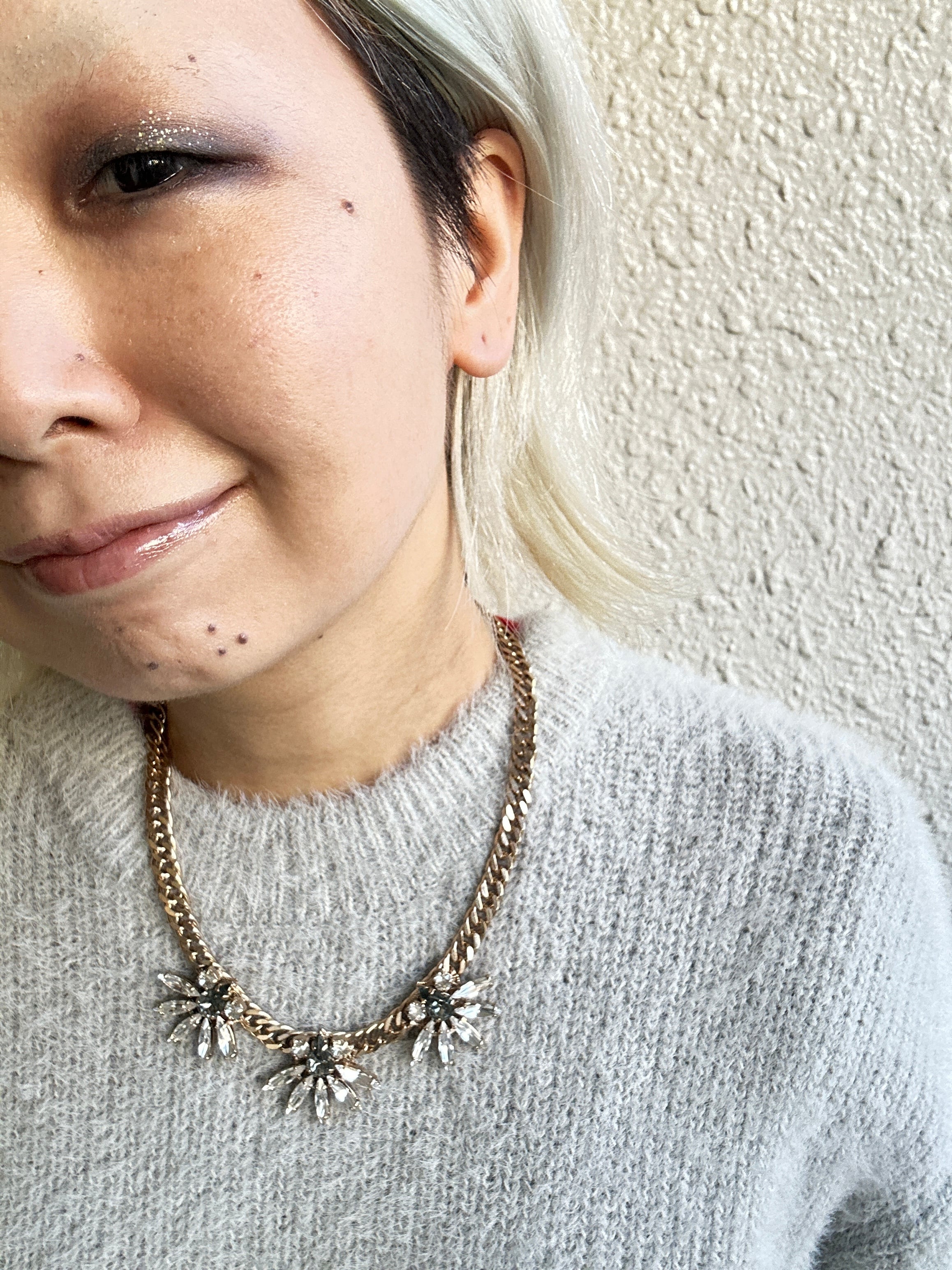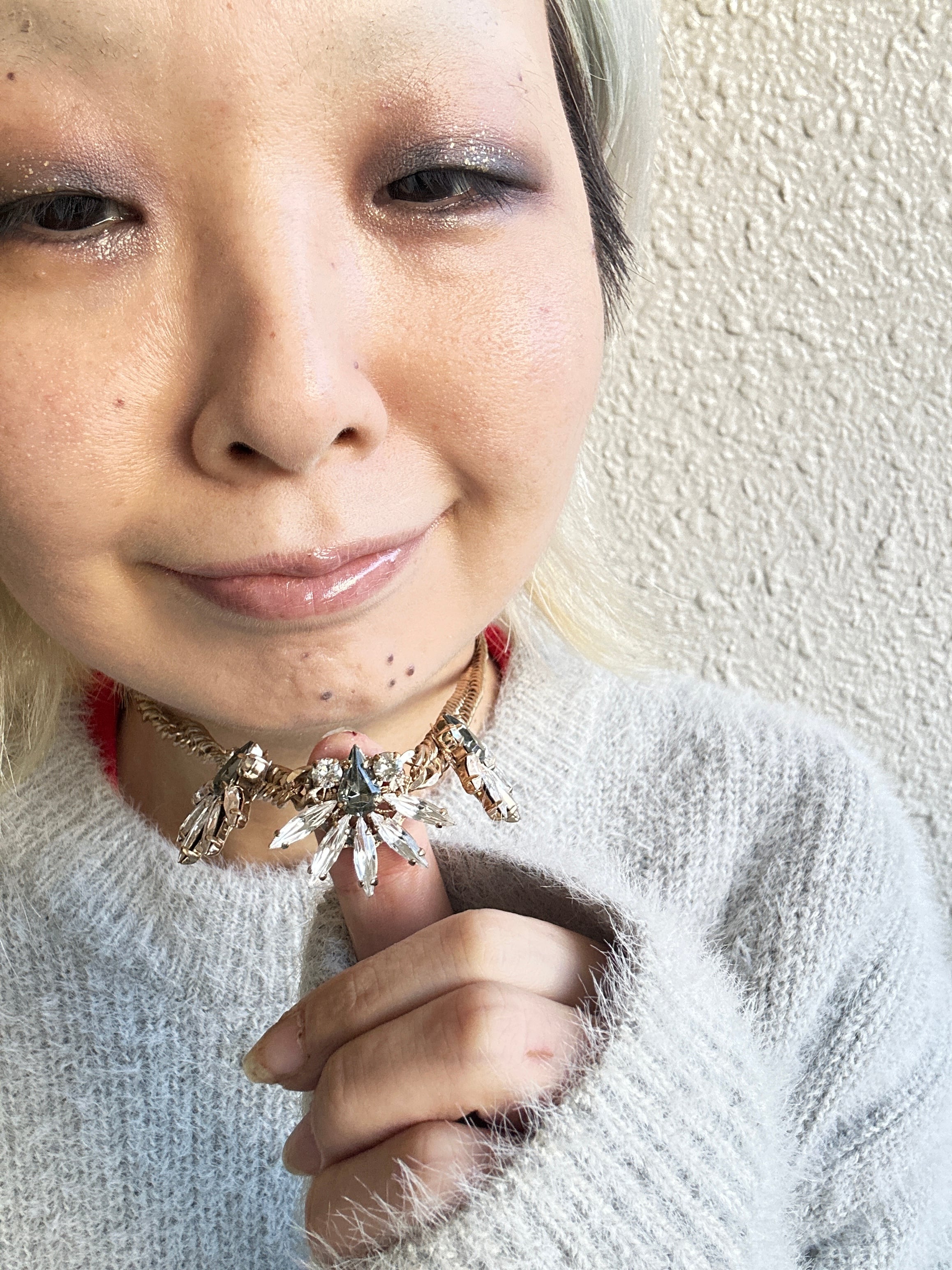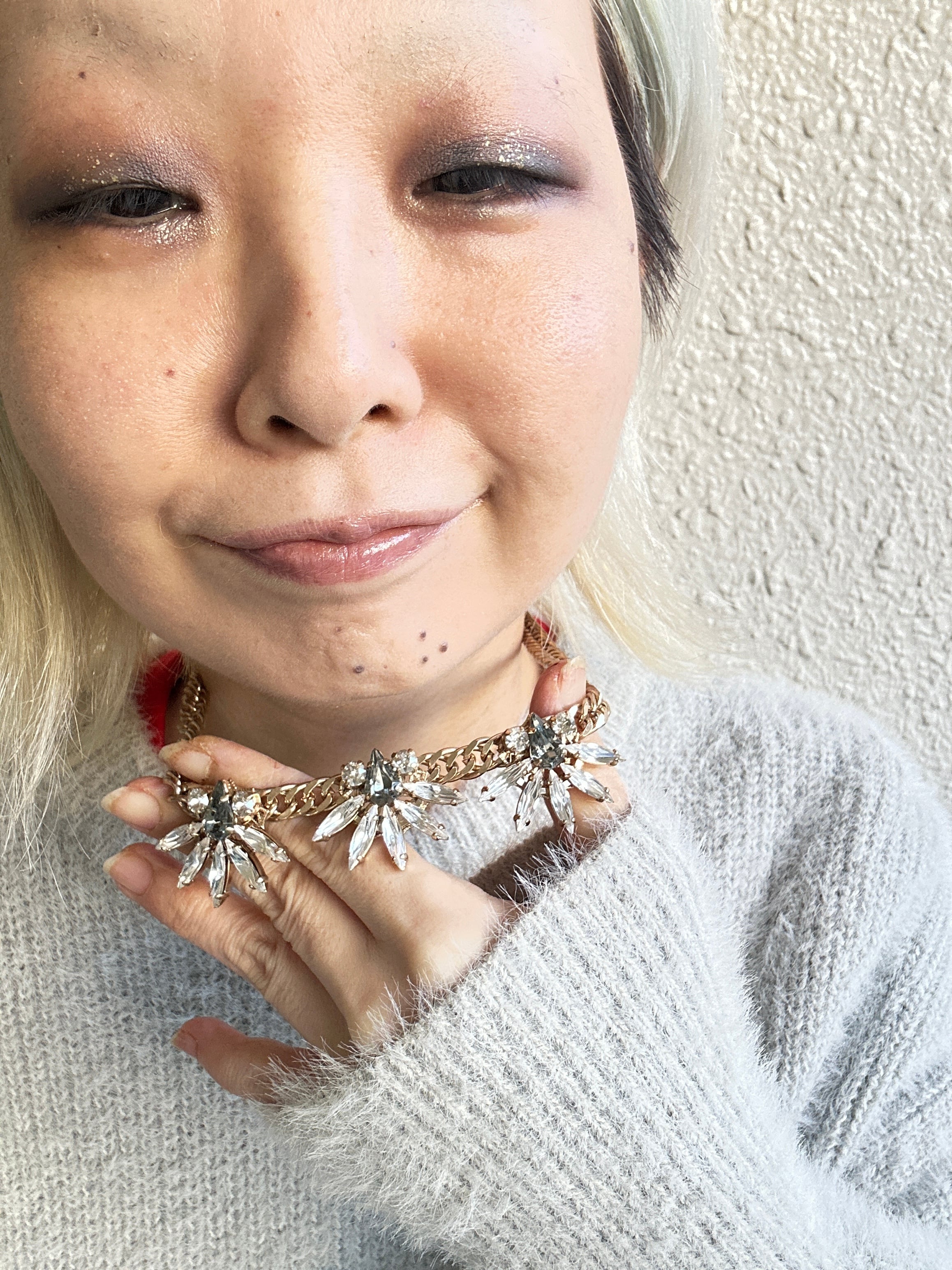 普通に私の着画の様に白のニットにも合うオールマイティーなネックレスです。