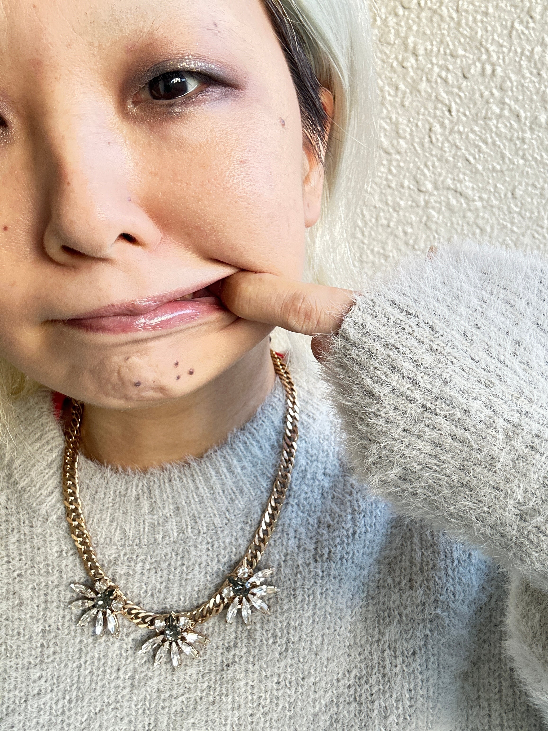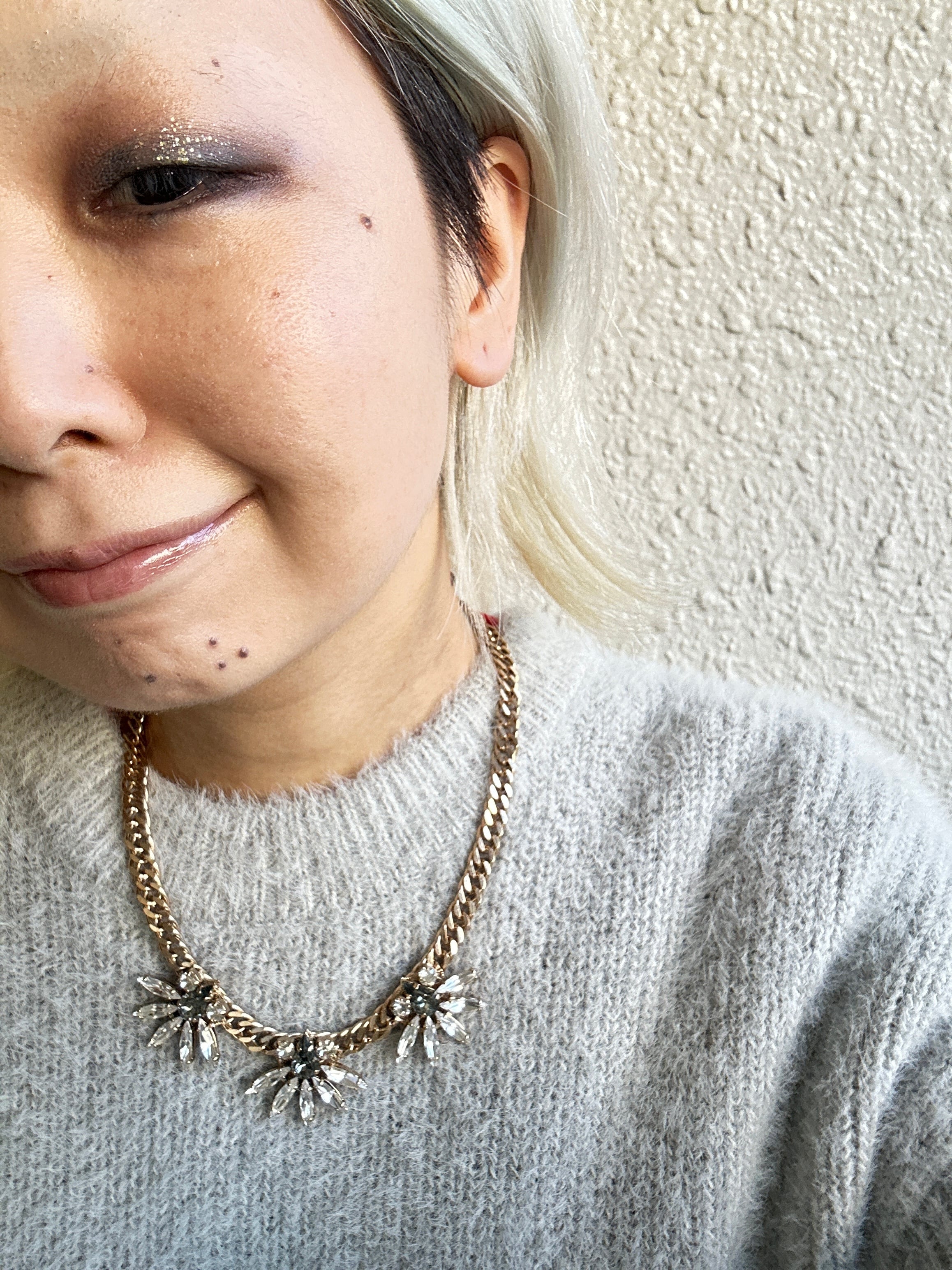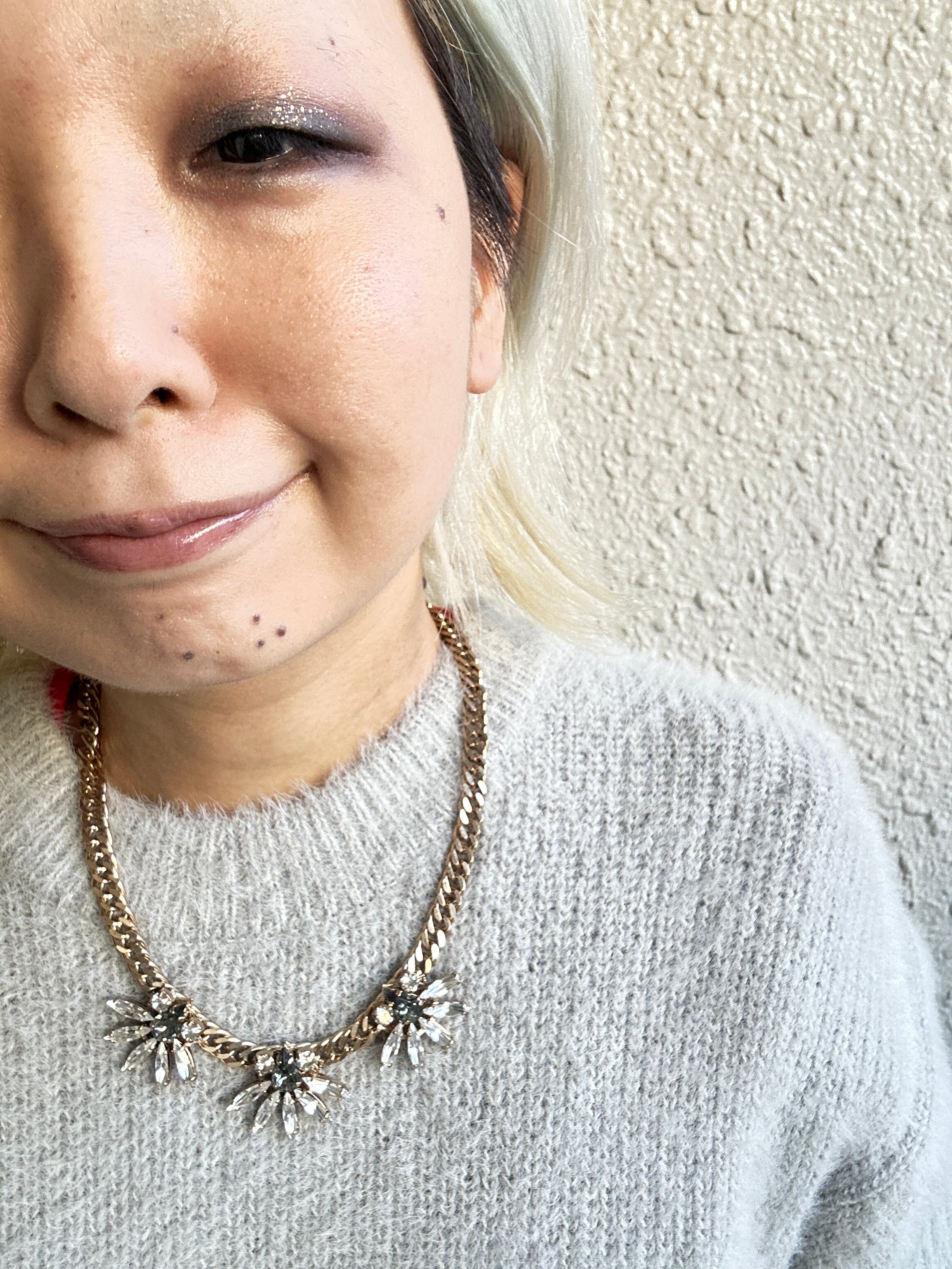 普通に私の着画の様に白のニットにも合うオールマイティーなネックレスです。
