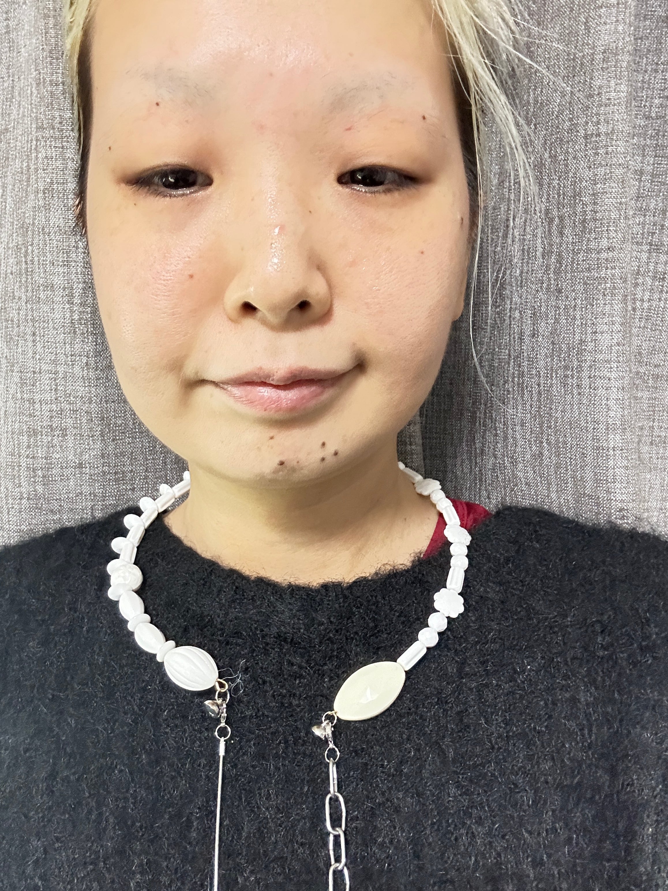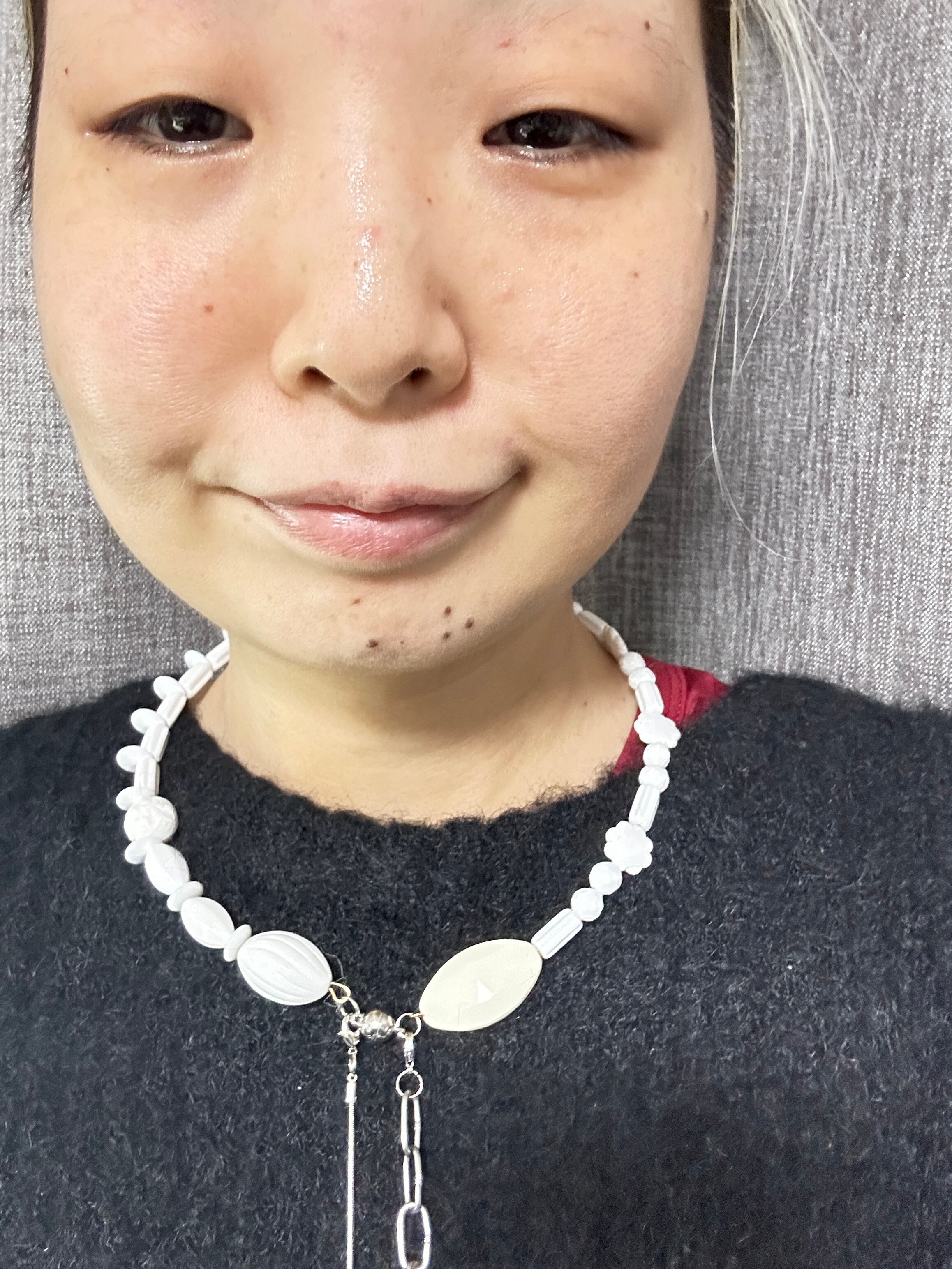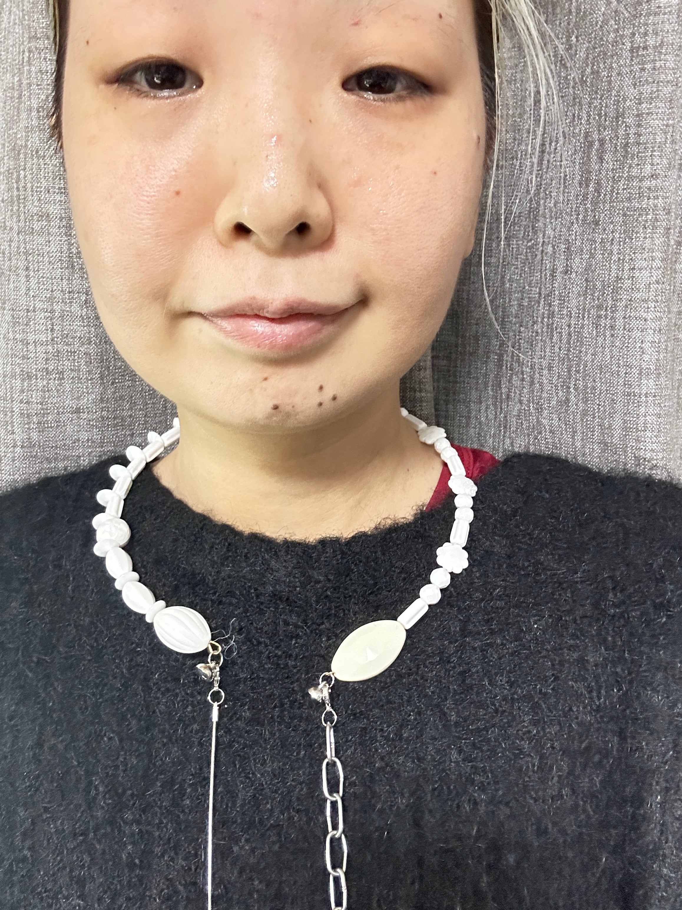 あとは後ろにチェーンを回すと普通のビーズのネックレスを着けているようですが、