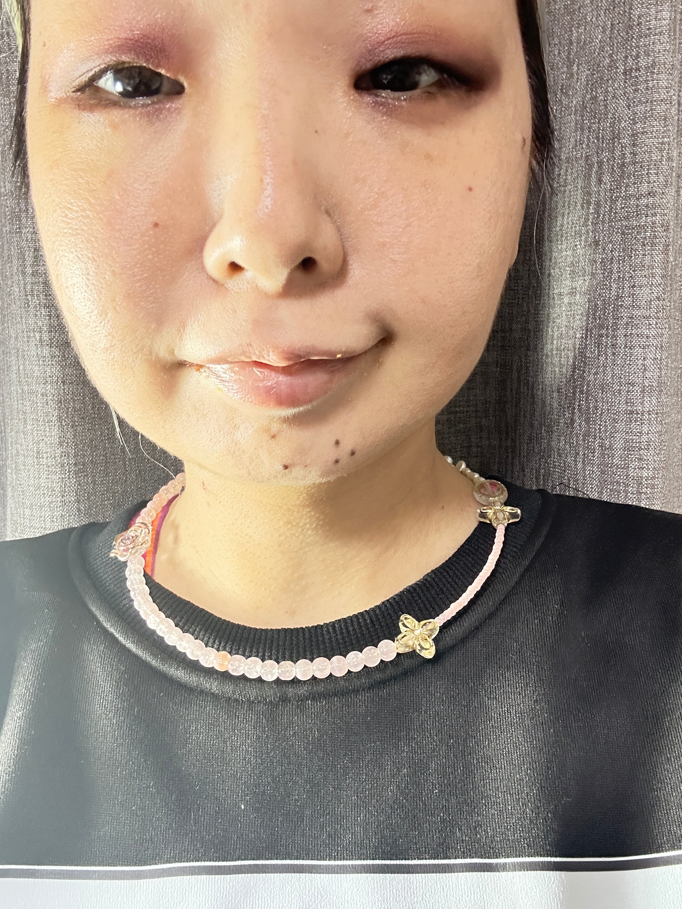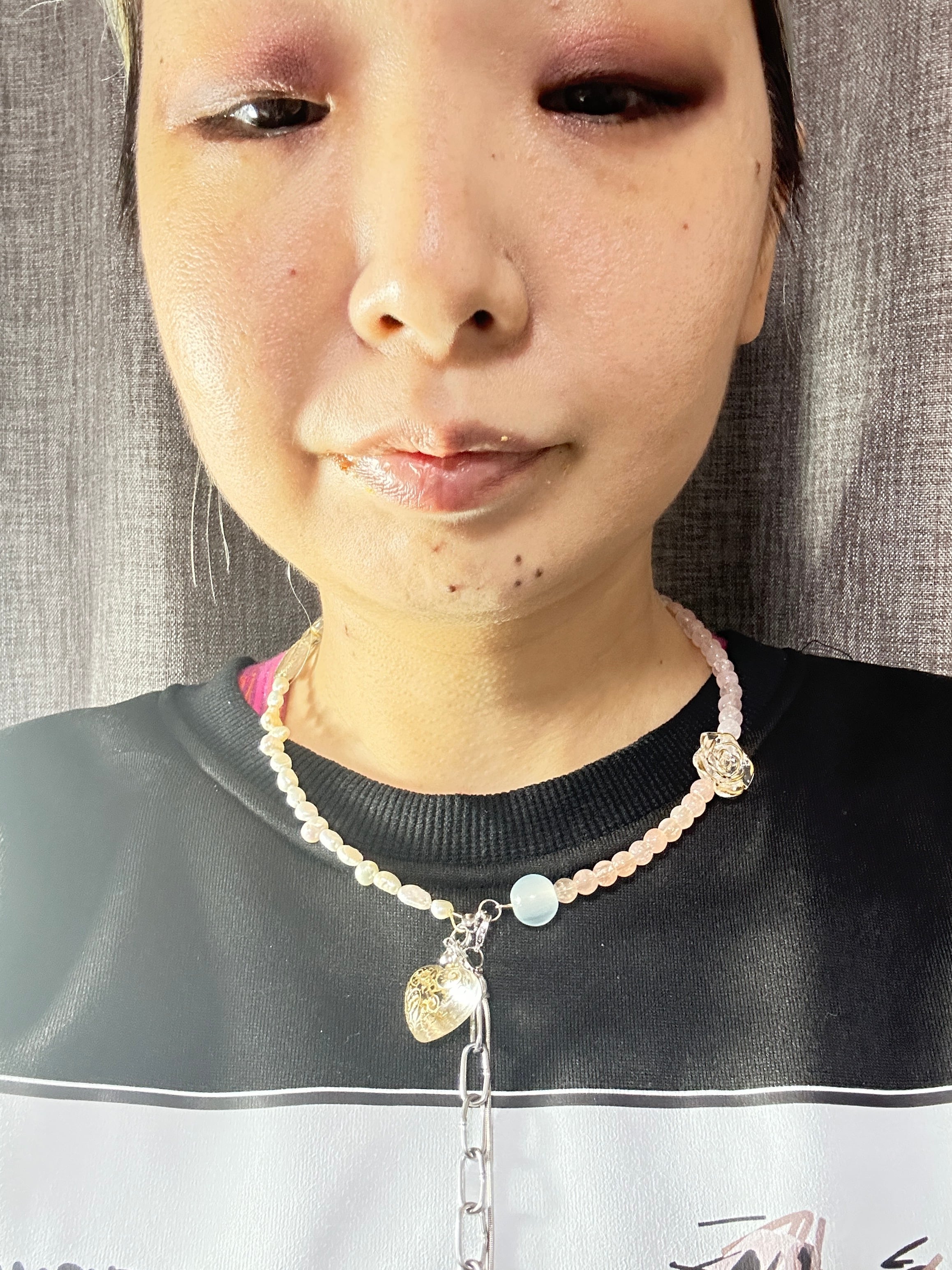 あとは後ろにチェーンを回すと普通のビーズのネックレスを着けているようですが、