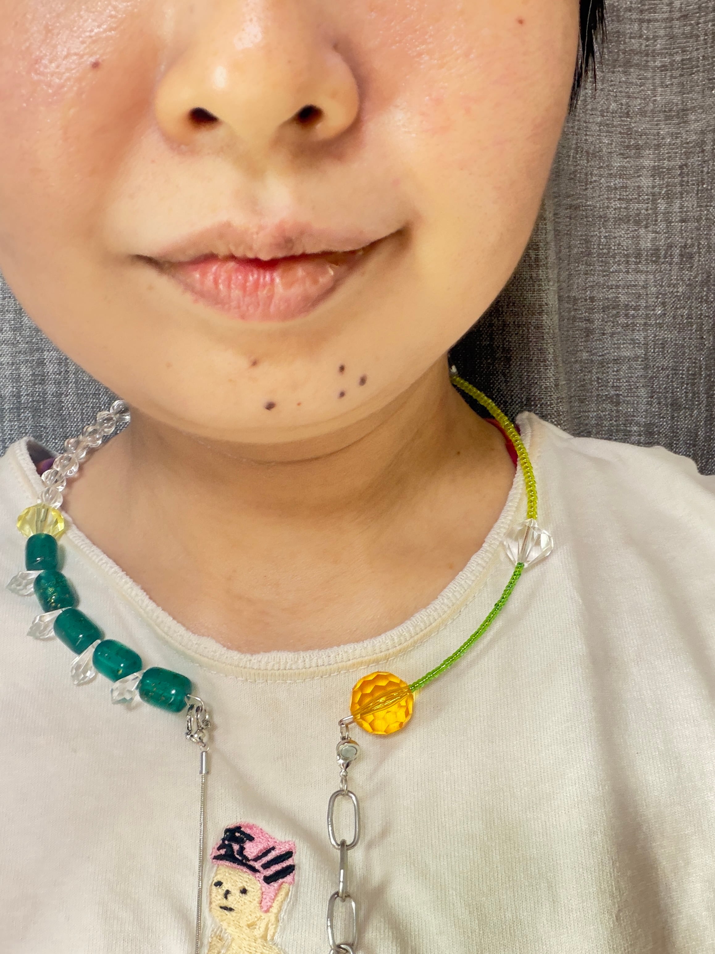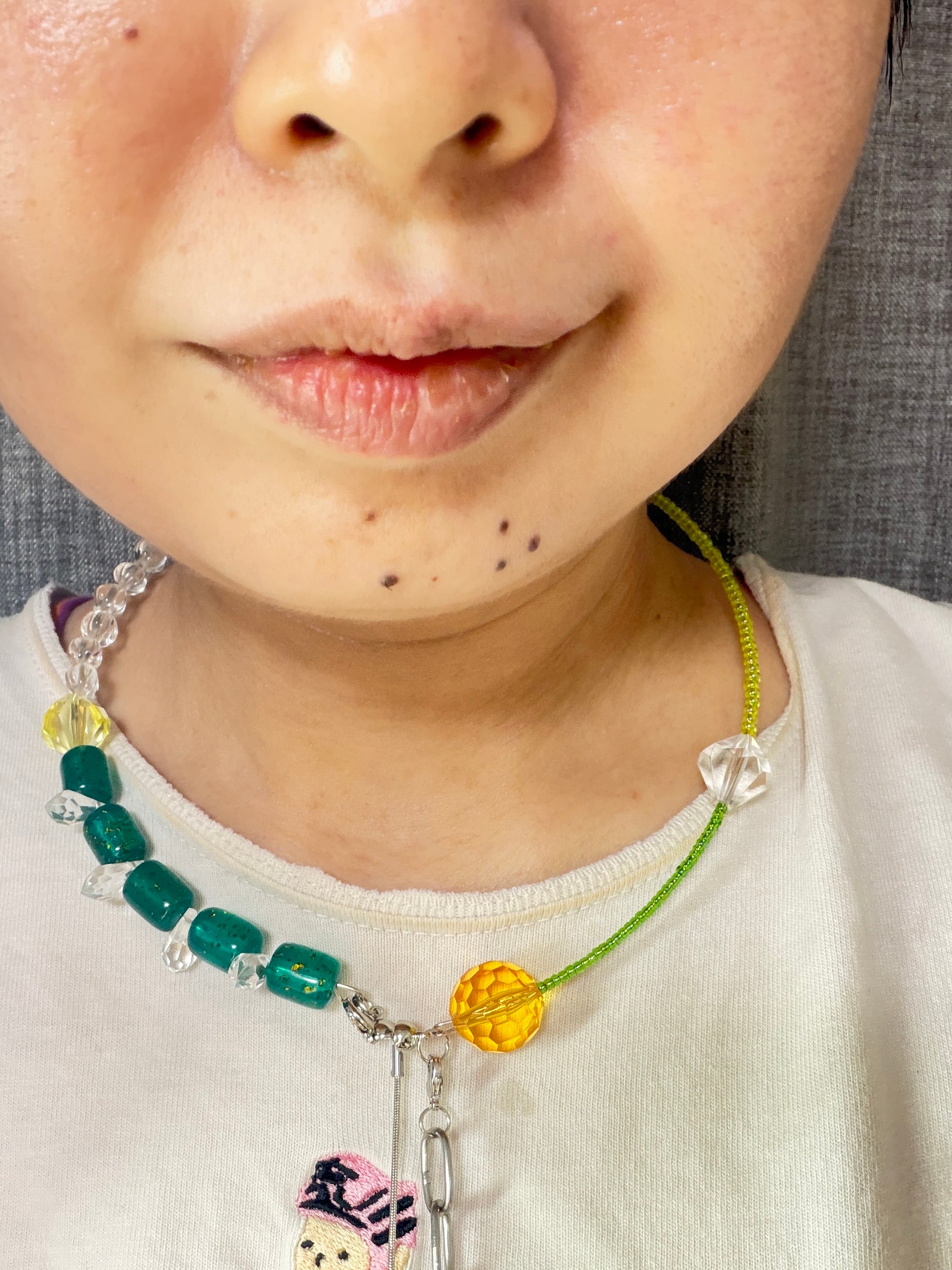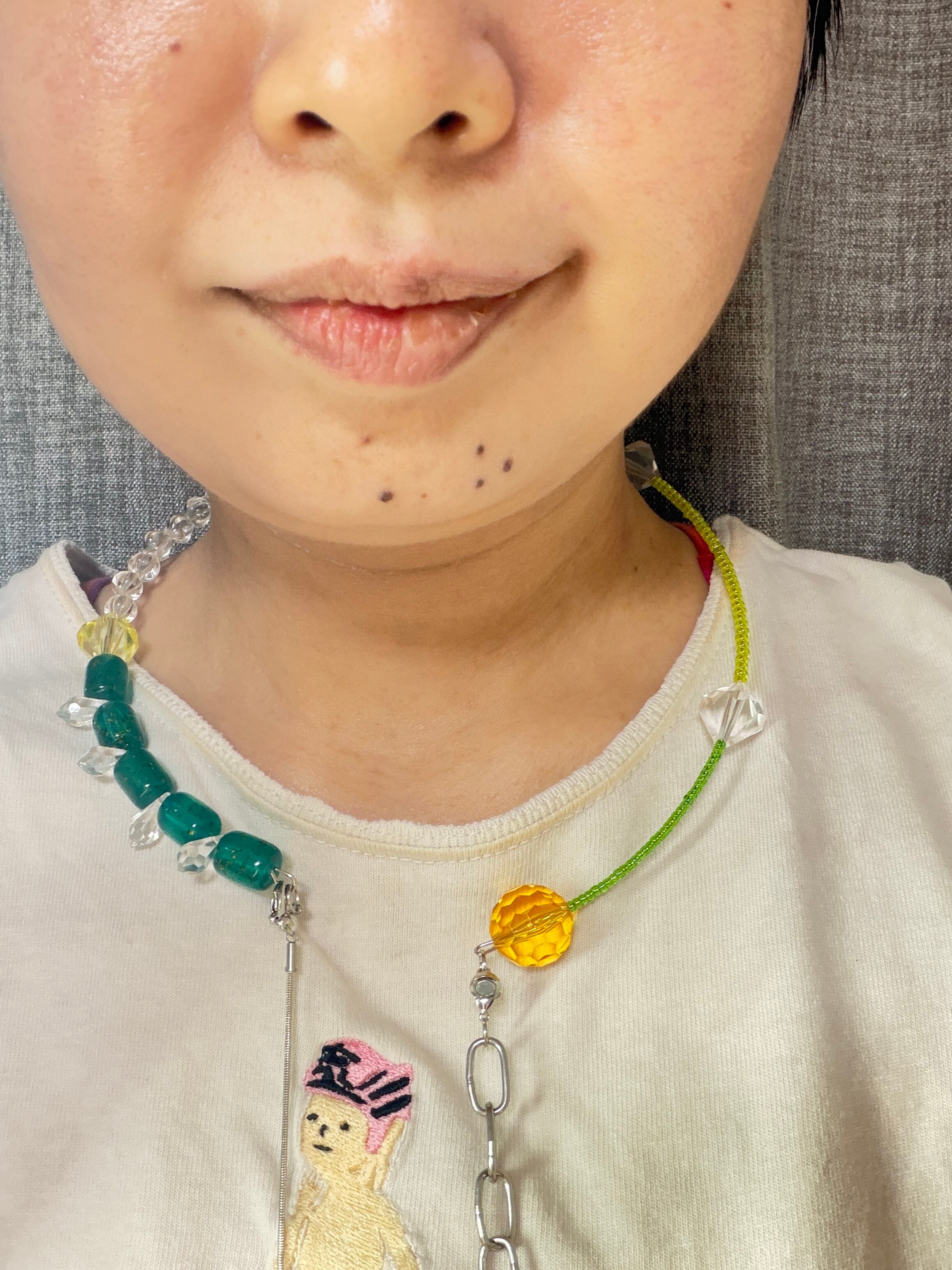 あとは後ろにチェーンを回すと普通のビーズのネックレスを着けているようですが、